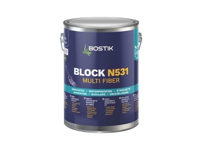 BLOCK N531 MULTI FIBER е уплътнител, подсилен с дралон и въглеродни влакна, издръжлив на UV радиация, премоства пукнатини до 10 mm, не съдържа битум, катран или азбест и има добра адхезия дори върху влажни/мокри повърхности. Продуктът образува водоустойчиво уплътнение веднага след нанасяне, което се втвърдява дори при температури до –5°C.