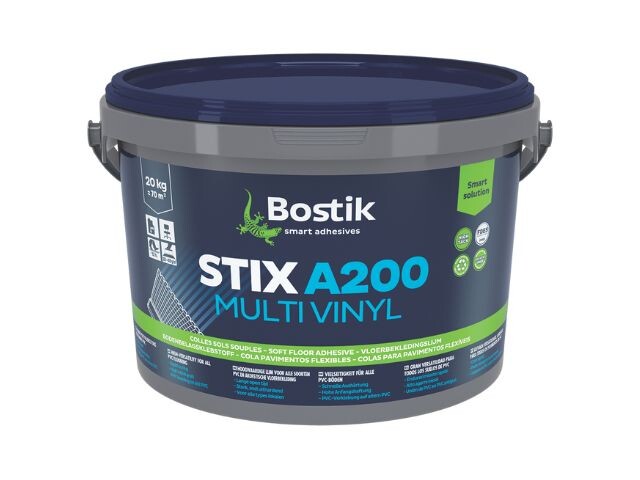 STIX A200 MULTI VINYL е многофункционално акрилно лепило за полагане на меки подови настилки: хомогенни и хетерогенни PVC, мокети с всякакъв вид подложка и подови настилки с естествени влакна.