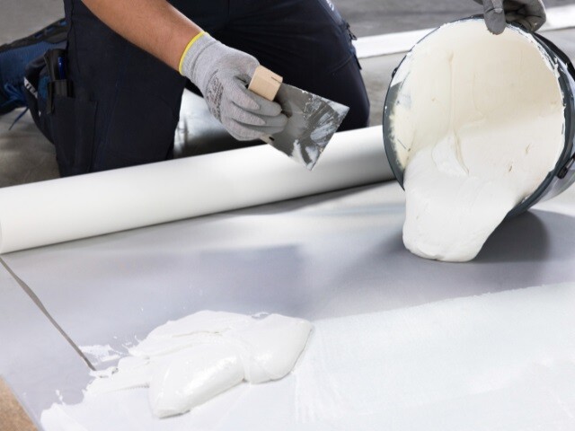- Appliquer la colle R3BOND® ADHESIVE à l’aide d’une spatule TKB A2 (400 à 450 g/m²), tout en déroulant la trame R3BOND® GRID au fur et à mesure de l’application de la colle.