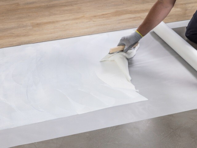 - Procéder à l’encollage avec la colle R3BOND® ADHESIVE à l’aide d’une spatule TKB A2 (400 à 450 g/m²), tout en déroulant la trame R3BOND® GRID au fur et à mesure de l’application de la colle.