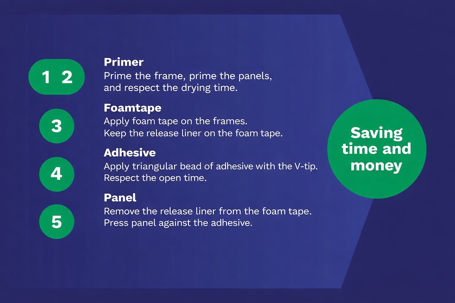 Some facade panel adhesive systems require as many as ten to fourteen steps during application. Bostik Paneltack® delivers reliable bonding in just five straightforward steps. This is largely because Bostik primers and adhesives combine essential properties. Take the wash primer. It does it all: degreases, cleans and endhances adhesion in one step. As a result, applicators only need to follow five clear steps, saving valuable processing time without compromising on quality, durability, or reliability.