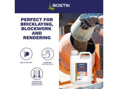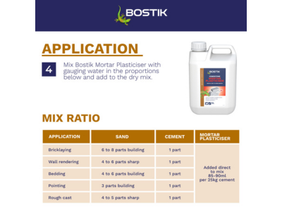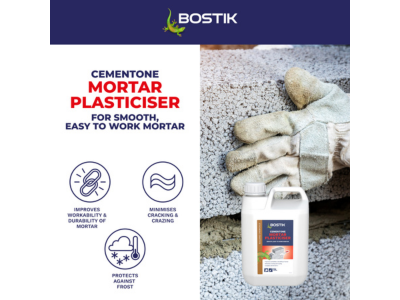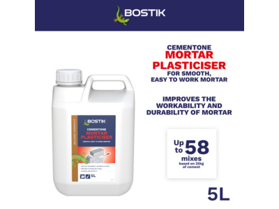 Bostik Mortar Plasticiser (formerly known as Cementone Cemplas Mortar Plasticiser) is a blend of modified ligninbased surface-active agents free from chlorides. It improves the workability of mortar without the addition of lime. It helps reduce grittiness to provide a smooth easy to work mortar with improved durability and protection against frost. It also reduces the water content of the mortar. Bostik Mortar Plasticiser is suitable for use to improve mortars for applications such as; bricklaying, blockwork, and rendering.