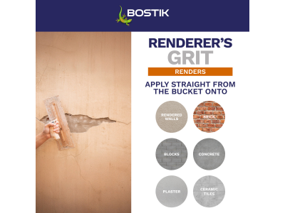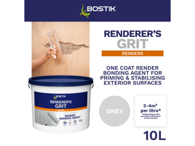 Bostik Renderer’s Grit has been specially developed for the rendering professional. Previously called Renderer’s Stabilising Primer, it primes and stabilises most exterior surfaces to give extra grip prior to the application of new render.