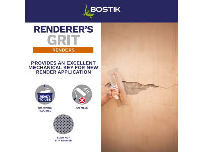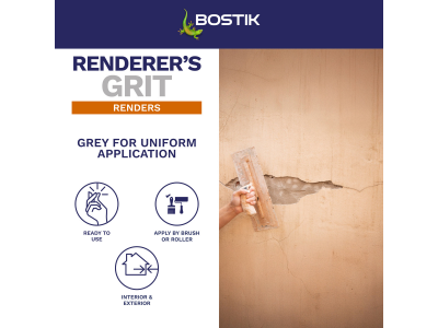 Renderer’s Grit can also be used on internal shiny surfaces such as sound, well adhered ceramic tiles before plastering. Bostik Renderer’s Grit is coloured grey to show uniform coverage and only one coat is required using a short pile roller or soft brush to provide an even key for render. It gives a more uniform surface that dries evenly, providing excellent adhesion and a faster, easier finish. It reduces suction on porous surfaces, allowing a consistent rendering working time and reducing the risk of cracking.
