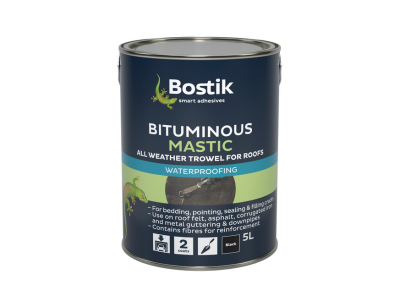 Bostik Bituminous Mastic for Roofs is a multi-purpose trowel grade bituminous material for waterproofing, stopping, bedding, pointing and sealing. It can be applied to mastic asphalt, roofing felt, corrugated iron, cast iron, fibre cement, slates, lead, copper, zinc, concrete and timber. Bostik Bituminous Mastic for Roofs dries to a flexible black material which remains soft and pliable for a long time after application.