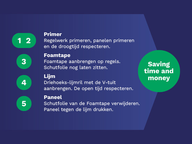 Bij Paneltack zijn extra handelingen, zoals reinigen en droogwrijven van de ondergrond, NIET nodig! Daardoor is Paneltack het snelste systeem voor het verlijmen van gevelbekleding.