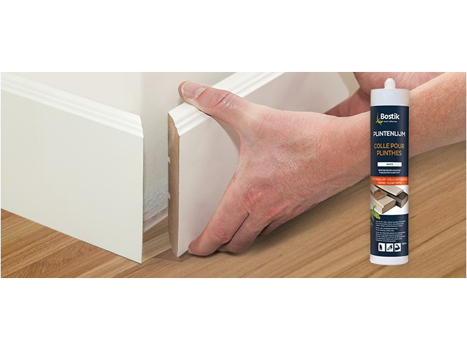 De Bostik Plintenlijm is een universele, door Bostik ontwikkelde, montagelijm voor plinten en profielen. Deze lijm en voegkit in één is overschilderbaar met de meeste alkydharslakken en watergedragen verven en hecht goed op op diverse materialen. De Bostik Plintenlijm is geschikt voor het verlijmen van plinten en profielen van hout, mdf, (natuur)steen, pvc, rvs of aluminium op ondergronden zoals steen, beton, baksteen, stucwerk, en dit eveneens voor verlijmingen op oneffen ondergronden en op natuursteen. De Lijm hecht meteen, dus klemmen is niet nodig. De Bostik Plintenlijm is direct leverbaar in kokers van 290 ml.