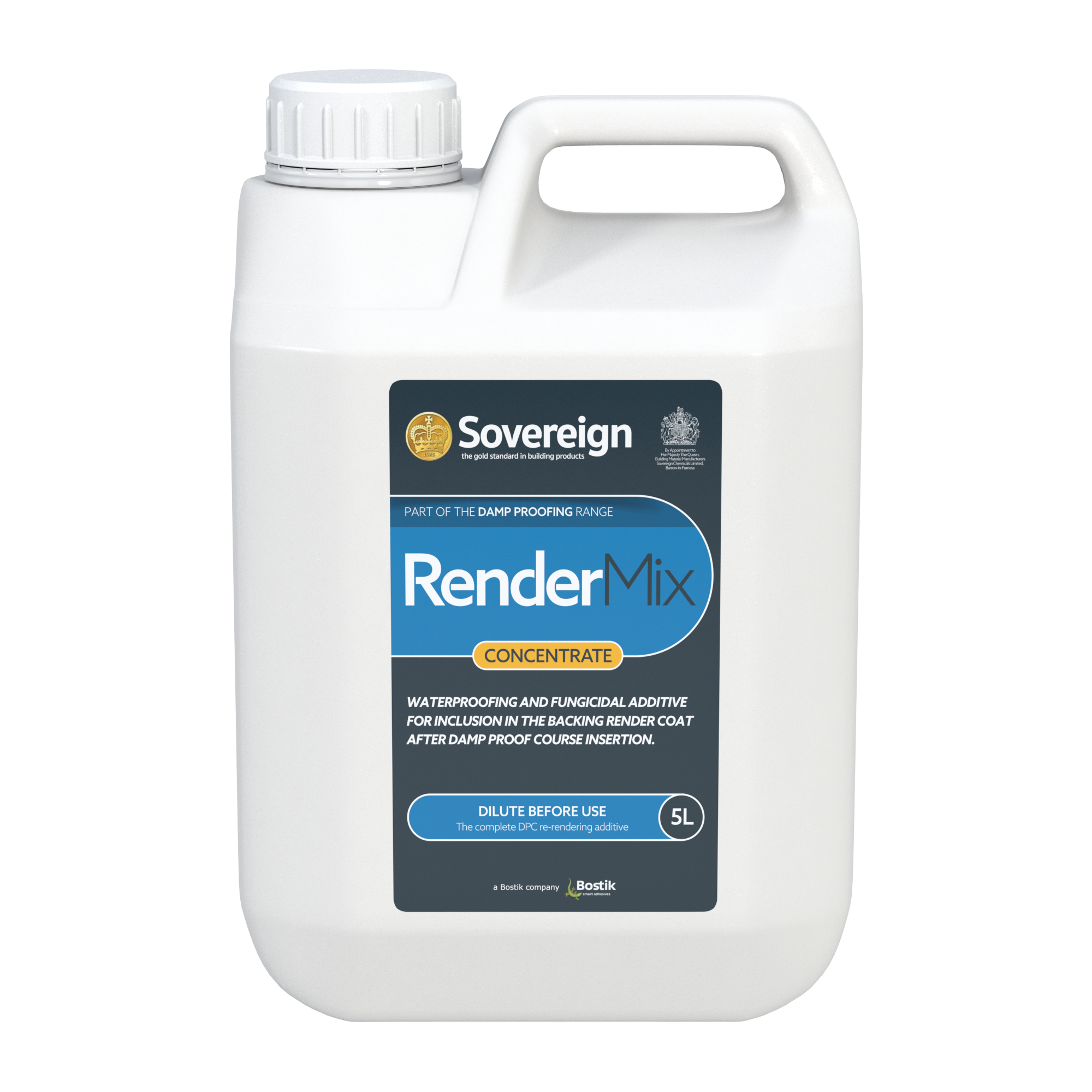 Sovereign RenderMix is a waterproofing additive for backing render coat after the insertion of a DPC injection. When used in sand and cement renders, it provides enough workability to eliminate the need for further admixtures. RenderMix ensures that the hygroscopic salts are prevented from moving to the surface plaster and exhibiting secondary dampness. Not being a vapour barrier, Rendermix allows walls to dry out and breathe naturally.
