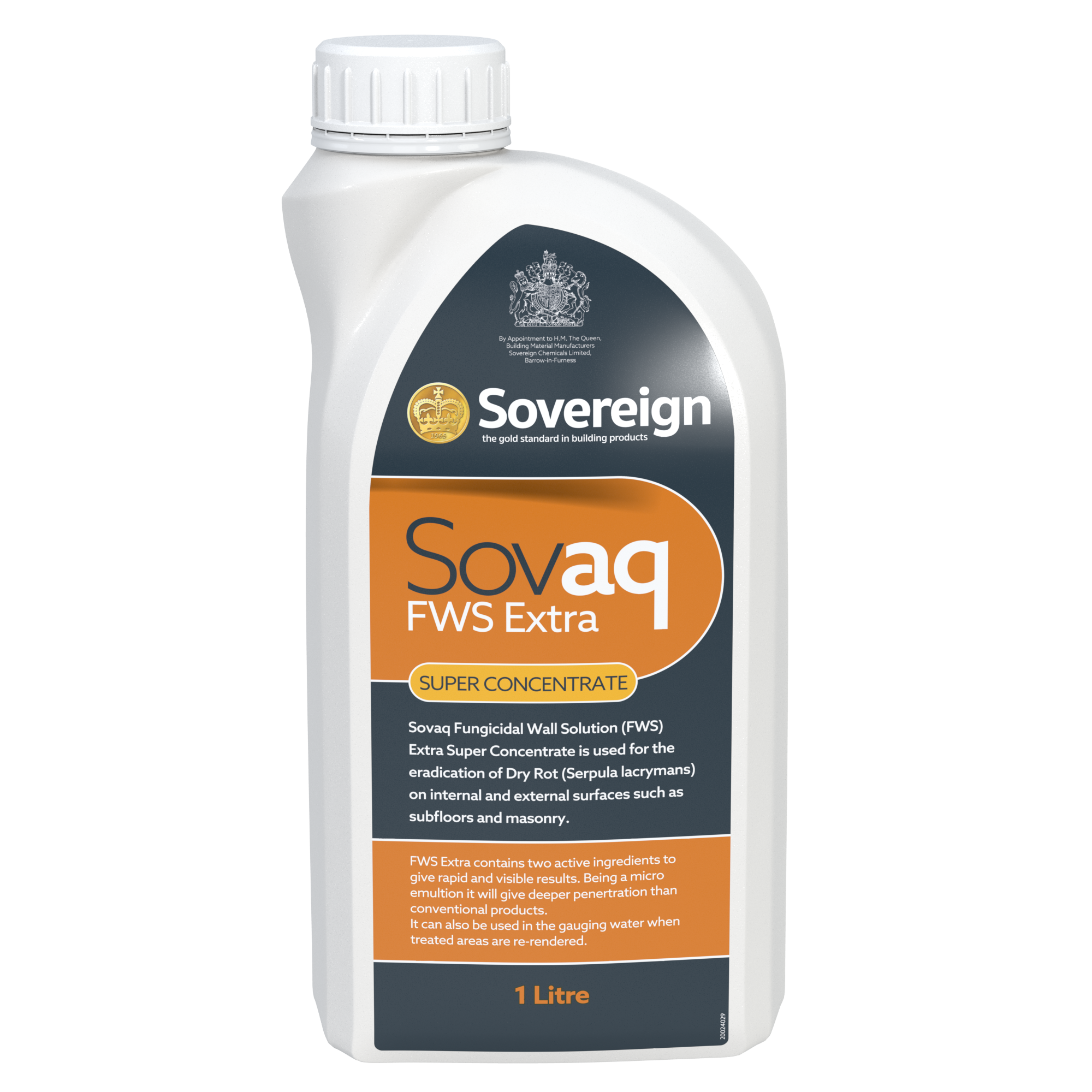 Sovereign Sovaq FWS Extra is a concentrated micro-emulsion used for treating dry rot in masonry. Sovaq FWS contains two active ingredients to give fast and visible results. As a micro emulsion, it provides deeper penetration than conventional products, and it can also be used in the mixing water when treated areas are to be re-rendered.